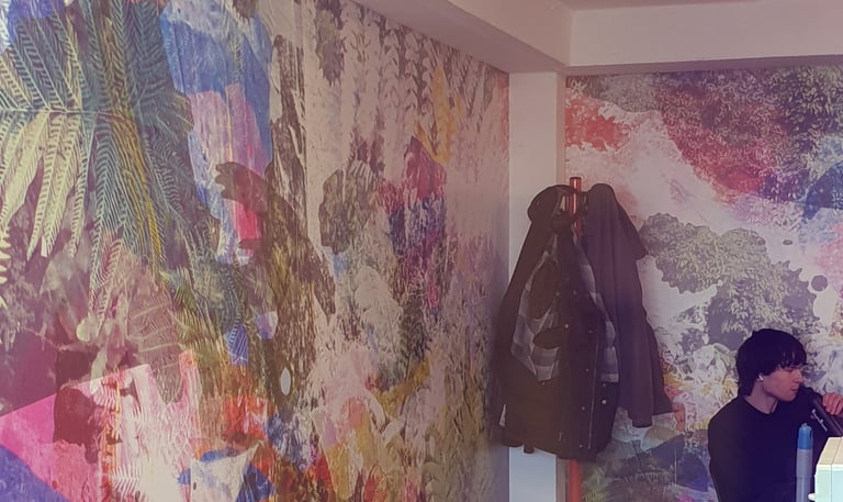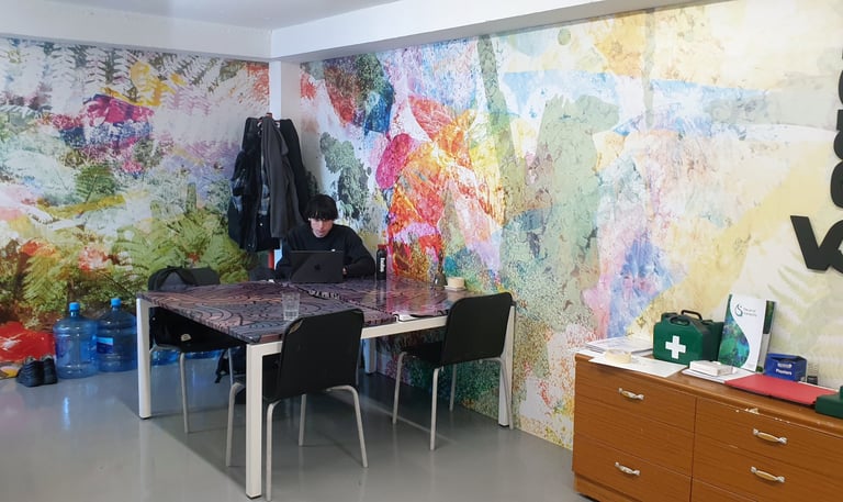 This project transformed the Hobs VC kitchen and dining area using a bold, nature-inspired artwork created in response to a simple brief: colour. The final installation brings warmth, energy, and calm to a previously neutral space while remaining practical and welcoming for everyday use.
